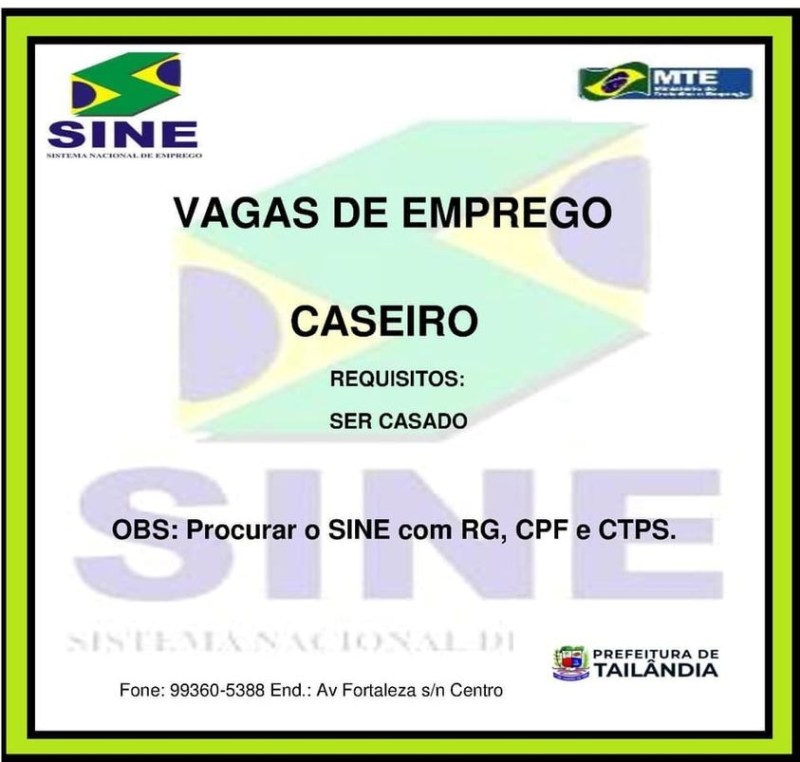 O Sistema Nacional de Emprego (Sine), divulgou nesta segunda-feira (24), vagas de emprego para o cargo de caseiro em Tailândia.