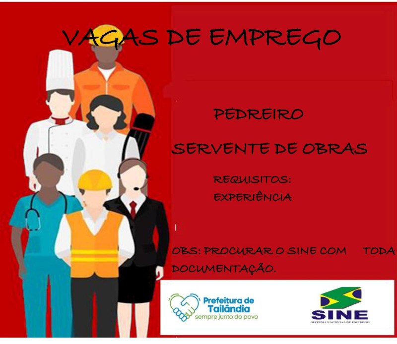 O Sistema Nacional de Emprego (Sine) divulgou novas vagas de emprego em Tailândia. Os currículos devem ser entregues até a próxima terça-feira, dia 24.