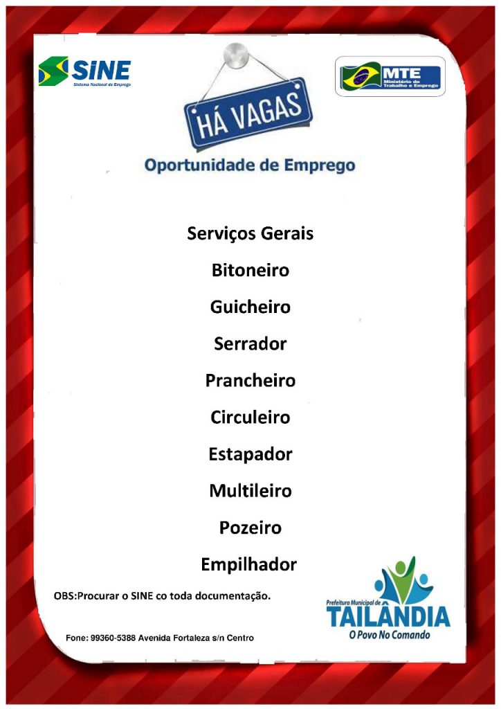 Os candidatos as vagas devem procurar o SINE em Tailândia, de 08h às 12h, com todos os documentos