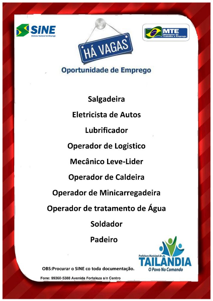 O Sistema Nacional de Emprego está ofertando vagas de emprego para mais de 20 áreas em Tailândia, nordeste paraense. Uma boa oportunidade para quem está desempregado ou quer se reposicionar no mercado de trabalho.