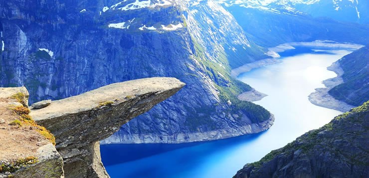 Trolltunga é um pedaço de rocha que paira sobre a montanha a cerca de 610 metros de altura. A Língua do Troll (tradução em português) fica aberta para excursionistas da metade de junho até mais ou menos a metade de setembro.