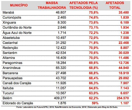 Na capital do estado, Belém, quase 255 mil empregos “humanos” poderão ser derrubados por robôs de alta performance, o equivalente a tirar do mapa uma cidade de trabalhadores praticamente do tamanho de Marabá. Já Eldorado do Carajás, que tem economia fortemente campesina e com postos de trabalho dependentes da administração pública municipal, é o município onde, proporcionalmente, mais empregos serão preservados: 41% do total.