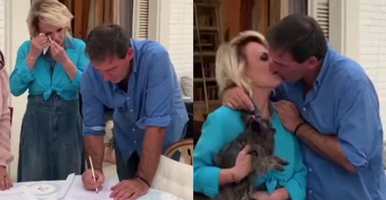 Emocionada, Ana Maria Braga chorou no momento da assinatura da certidão. Segundo Patrícia Poeta, a aliança que sela a união foi no estilo francês. “O Johnny decidiu fazer do jeito francês e o nome é escrito do lado de fora”, contou.