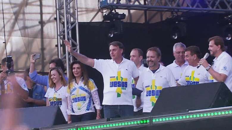O presidente pediu à plateia para mandar um grande abraço à evangélica Michelle, sua esposa, e ainda fez gracejo com o apóstolo Valdemiro Santiago, da Mundial do Poder de Deus, uma das autoridades políticas e religiosas no palco (o prefeito Bruno Covas também estava e acabou vaiado pela multidão).