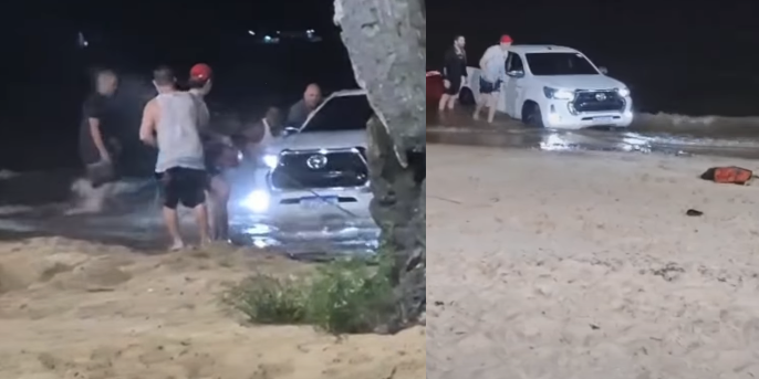 De acordo com relatos, o carro teria ficado preso na areia e, sem conseguir sair a tempo, acabou sendo alcançado pela água, ficando parcialmente submerso. A situação gerou preocupação entre as pessoas que acompanhavam a cena.