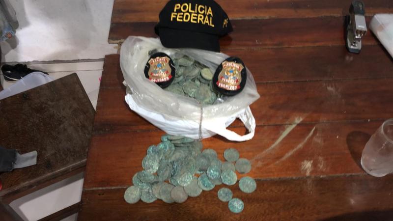 Em um local demarcado como Sítio Arqueológico pertencente ao Instituto do Patrimônio Histórico e Artístico Nacional (IPHAN), os policiais encontraram várias moedas com datas da época do Brasil Império. O material apreendido é considerado patrimônio histórico nacional e são bens da União.