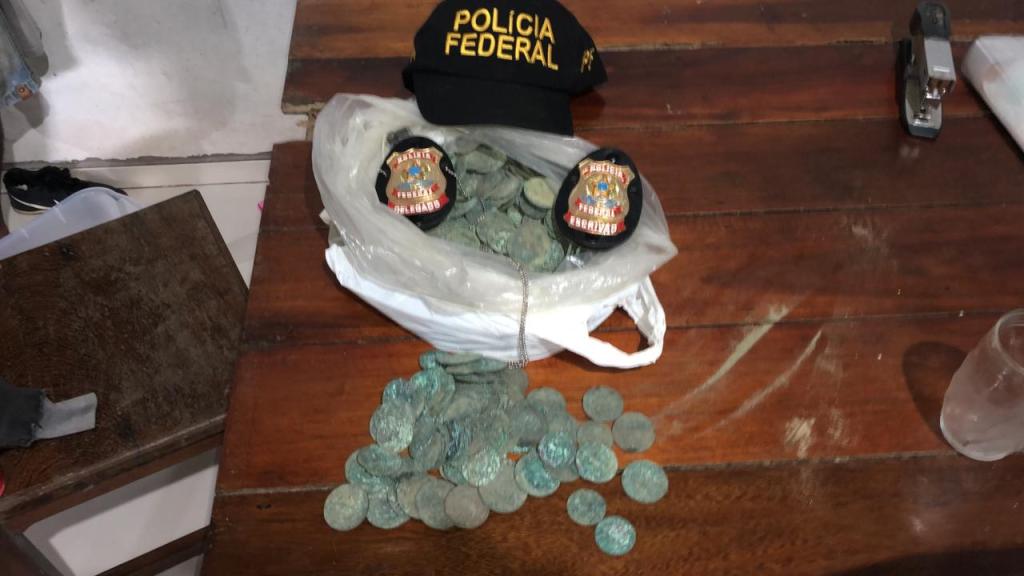 Em um local demarcado como Sítio Arqueológico pertencente ao Instituto do Patrimônio Histórico e Artístico Nacional (IPHAN), os policiais encontraram várias moedas com datas da época do Brasil Império. O material apreendido é considerado patrimônio histórico nacional e são bens da União.