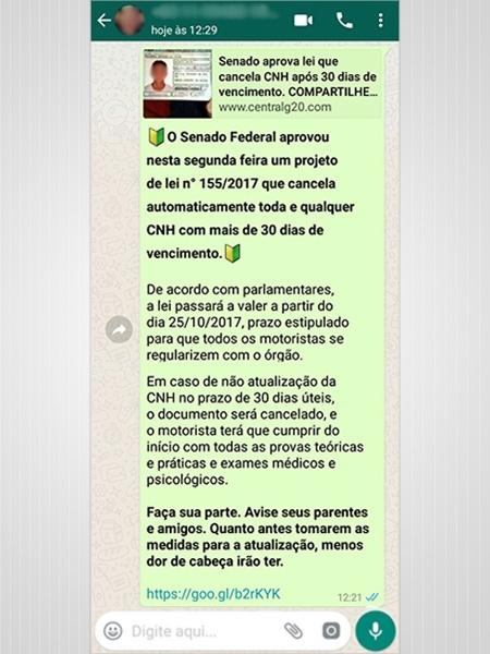 De acordo com a corrente, o Senado Federal aprovou o projeto de lei nº 155/17, “que cancela automaticamente toda e qualquer CNH com mais de 30 dias de vencimento”. Os motoristas teriam até o dia 25 de outubro para se regularizarem.