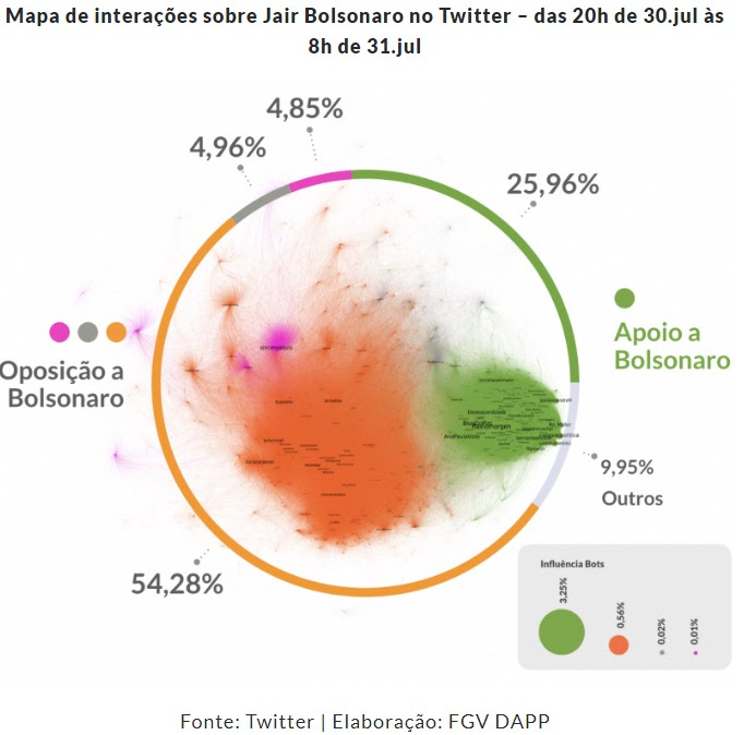 As interações motivadas pela entrevista de Jair Bolsonaro no “Roda Viva” geraram dois principais grupos de discussões, com posições opostas no debate. O maior deles, em laranja no mapa a seguir, agregou mais de 54,2% das contas em interação e é composto de perfis que se posicionam de forma contrária ao deputado federal. O segundo maior grupo, em verde, tem cerca de 26% dos perfis e demonstra apoio a Bolsonaro. Também foram identificados dois grupos menores (rosa e cinza), com quase 5% dos perfis, cada. A presença de robôs não foi significativa na análise.