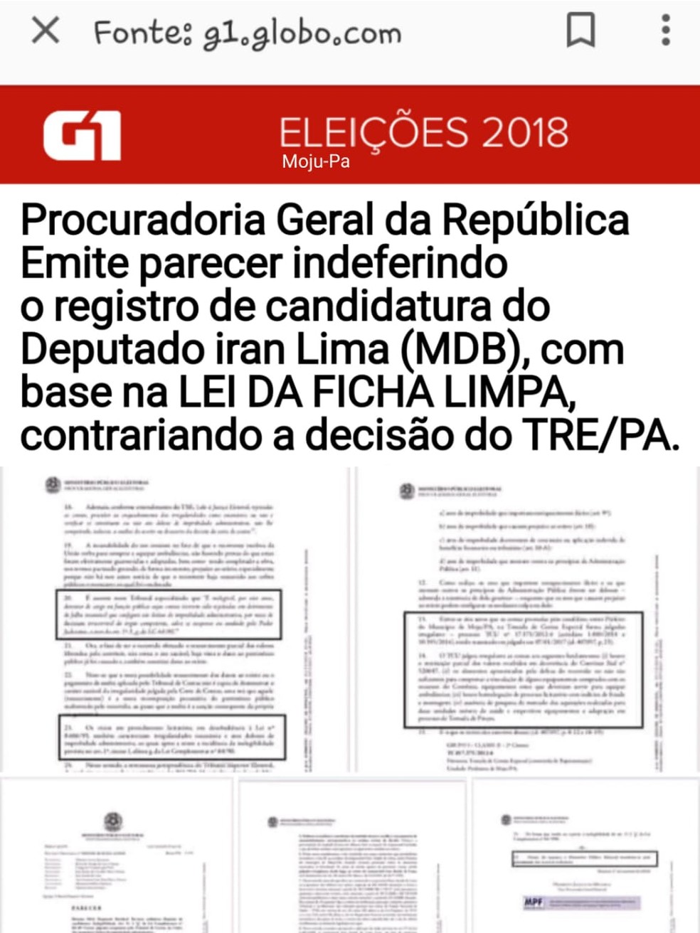 Circula pelas redes sociais um print como se fosse de uma reportagem publicada pelo G1 que afirma que a Procuradoria Geral da República (PGR) emitiu um parecer indeferindo o registro de candidatura do deputado estadual e candidato à reeleição Iran Lima (MDB-PA), da cidade de Moju, nordeste paraense.