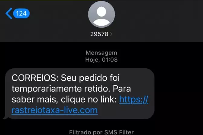 - O SMS contém um link para um site falso que imita a página oficial dos Correios;