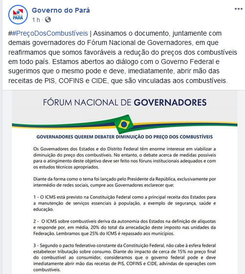 O governo do Pará soltou nota e, junto com outros entes da federação, pede que o governo federal abra mão de PIS/CONFINS e CIDE.