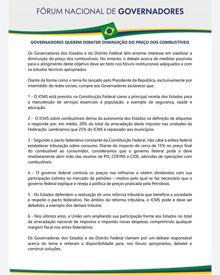 O presidente criticou o modelo dizendo que os governadores “não admitem perder receita, mesmo que o preço do litro nas refinarias caia”. A ideia de Bolsonaro é que o ICMS seja cobrado sobre o litro do combustível, assim a arrecadação dos estados não aumentaria ou cairia, independentemente das variações de preços.