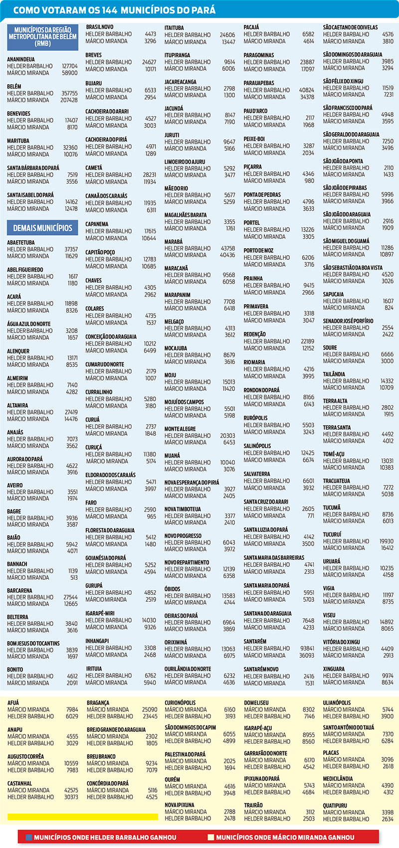 Em Ananindeua, cidade que já foi administrada por Helder por duas vezes, ele teve mais que o dobro de votos de Miranda. Foram 127.704 contra 58.900. Ananindeua tem o segundo maior número de eleitores do Pará: 322.428.