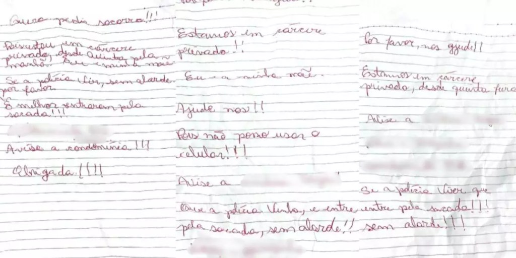 “Quero pedir socorro, pois estou em cárcere privado deste quinta (10 de julho) pela manhã. Eu e minha mãe”, diz um dos bilhetes. “Se a polícia vier, sem alarde, por favor. É melhor entrarem pela sacada.” “Ajude-nos, pois não nosso usar o celular.”