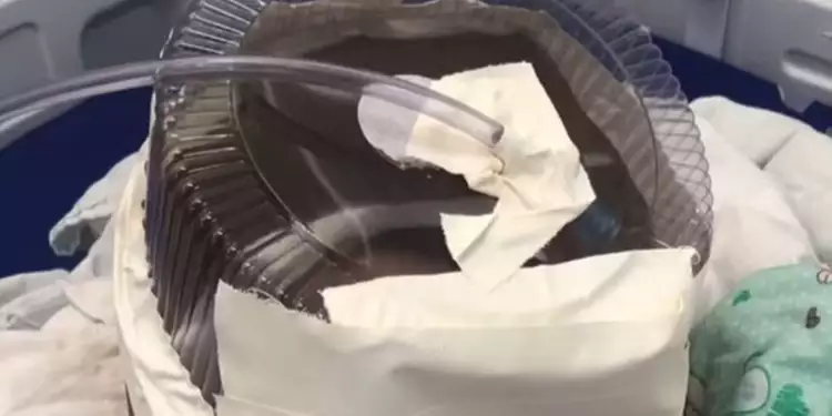 A embalagem de bolo utilizada como máscara de oxigênio foi ideia da médica Ellenn Salviano. Ao dar entrada em um hospital de Santa Cruz, interior do estado, no dia 8 de junho, o bebê estava com desconforto respiratório grave, congestão nasal, rinorreia (corrimento nasal), vômitos e diarreia. Por não haver Unidade de Tratamento Intensivo Pediátrica (UTI Pediátrica), a instituição solicitou vaga de internamento em outro hospital. Aos três meses e 20 dias, a criança precisou do respirador improvisado para estabilização do quadro.