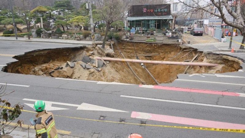 Um motociclista morreu ao despencar em uma cratera que se abriu repentinamente em uma avenida na Coreia do Sul.