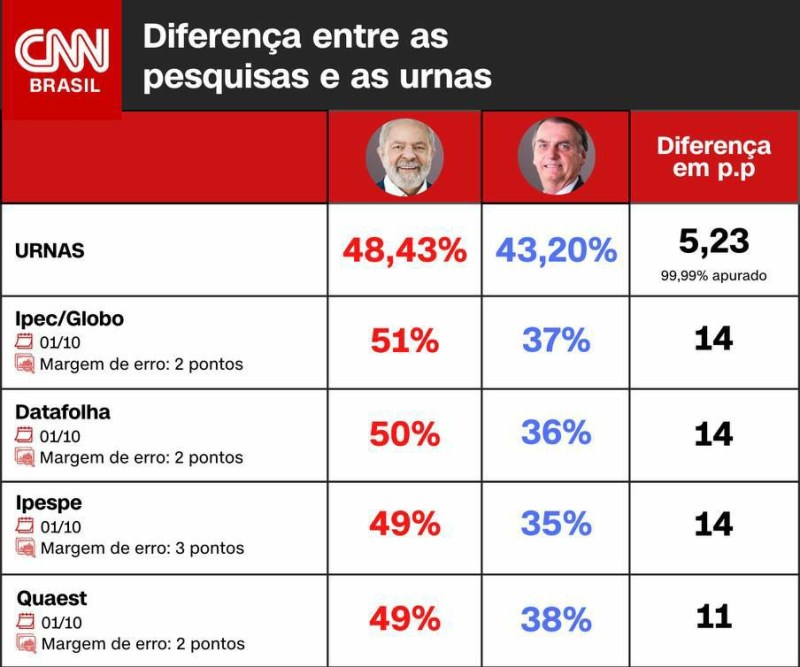O ex-presidente Luiz Inácio Lula da Silva (PT) recebeu 48,43% dos votos válidos neste domingo (2), contra 43,20% do presidente Jair Bolsonaro (PL), com 99,99% das urnas apuradas. Os números das urnas contrastam com as pesquisas eleitorais divulgadas na véspera.
