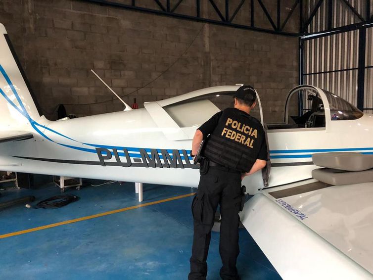 Policial observa aeronave apreendida durante operação Flak (Polícia Federal/divulgação)