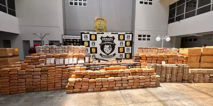 Uma tonelada e meia de drogas e fuzis foram apreendidos em Manaus, capital do Amazonas, nesta segunda-feira (19). A operação policial ocorria no Parque das Laranjeiras, bairro das Flores, quando o material foi achado em um galpão.