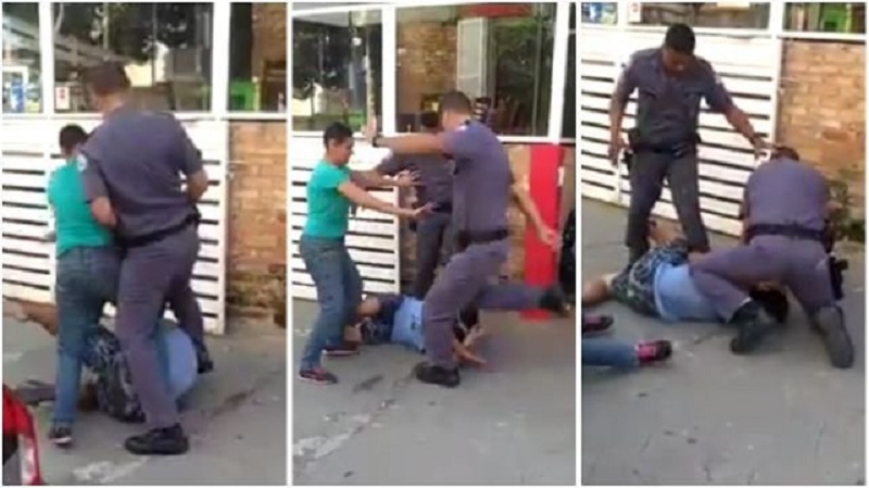 A companheira dele tenta conter a ação dos policiais, mas também é agredida com chutes e é empurrada. O caso ocorreu no último sábado (15), em um supermercado localizado na Vila Leopoldina, em São Paulo.
