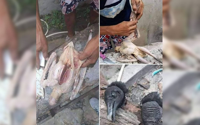 Nas imagens, é possível ver as aves sendo depenadas e a cabeça ao lado. A carne do urubu estaria sendo vendida ao preço “promocional” de R$ 5 o quilo.