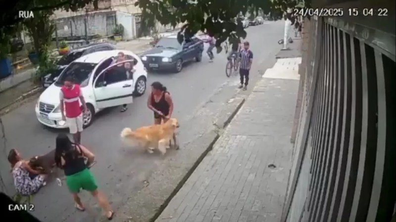 Uma jovem, identificada como Thayná, de 28 anos, grávida de sete meses, caiu no meio da rua, ao tentar afastar o seu cachorro de dois cachorros de grande porte em uma rua do bairro Castelo, em Santos, no litoral de São Paulo, na tarde de quinta-feira (24). Apesar do susto, ela, a bebê e o pet passam bem.