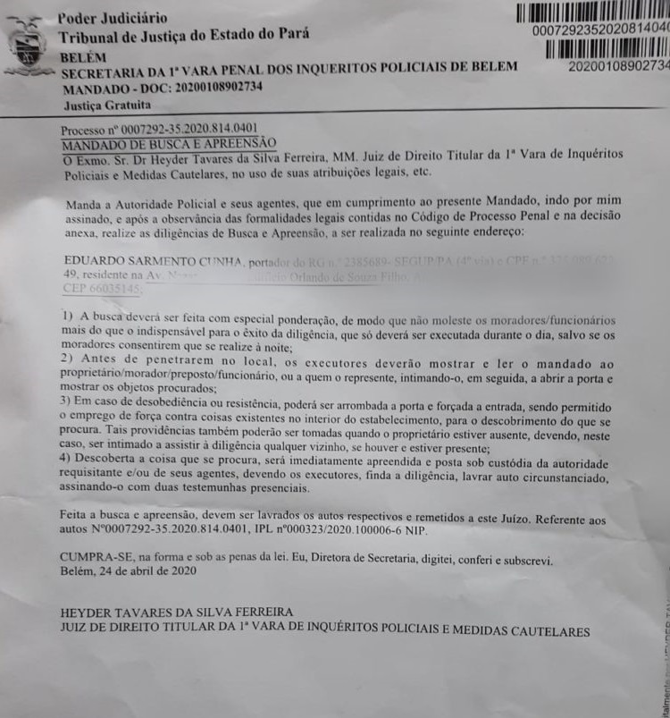 No dia 29 de abril, um dos sites mais acessados do Pará e que mais questionavam as ações do governo de Helder Barbalho, foi tirado do ar por uma ordem judicial. No dia anterior, a mesma ordem havia autorizado busca e apreensão de documentos, celulares, computadores, HDs e tablets, na casa do administrador do site, Eduardo Sarmento Cunha.