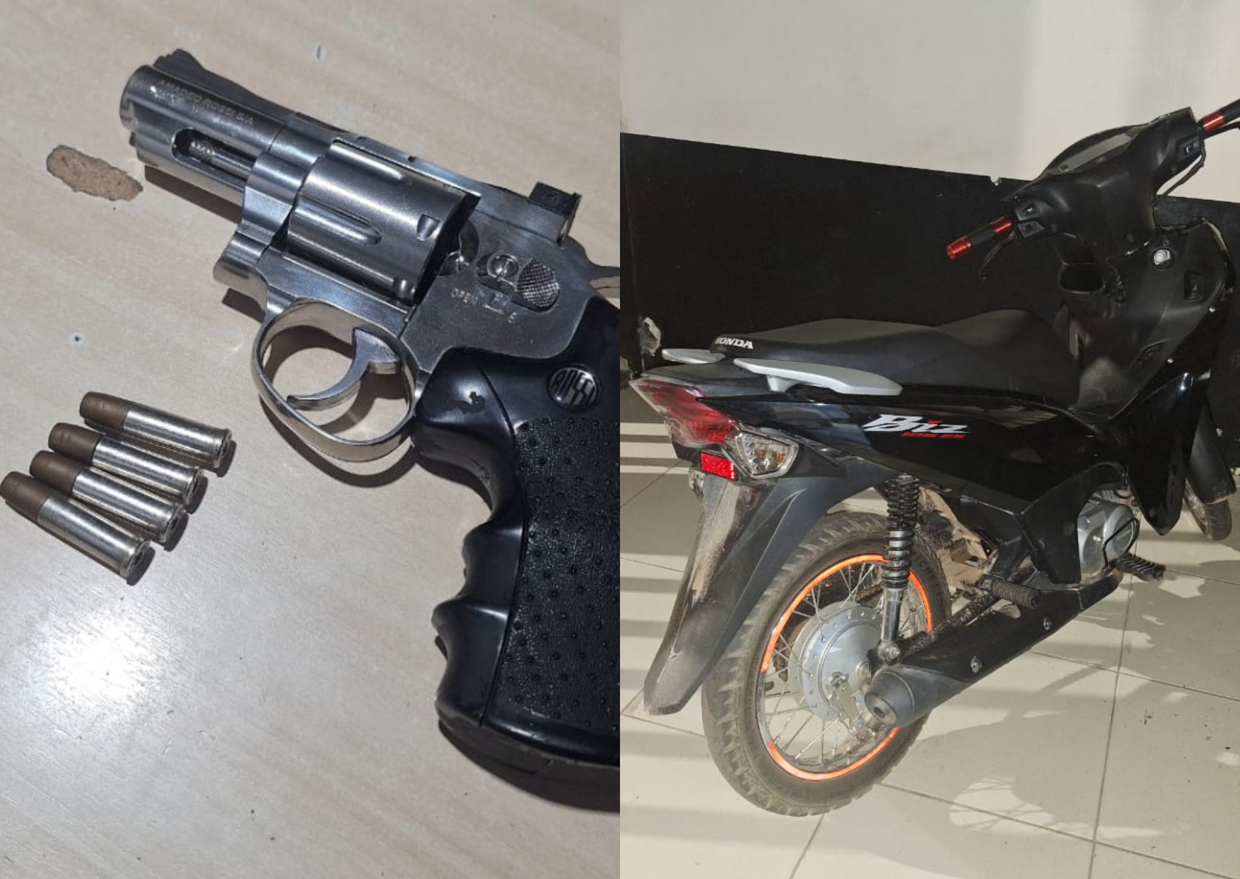 Segundo a PM, os jovens estavam em uma motocicleta Honda Biz sem placa. Com um deles, os policiais encontraram um simulacro de revólver calibre 38, carregado com quatro munições. Durante a tentativa de fuga, a dupla caiu da moto e acabou detida.