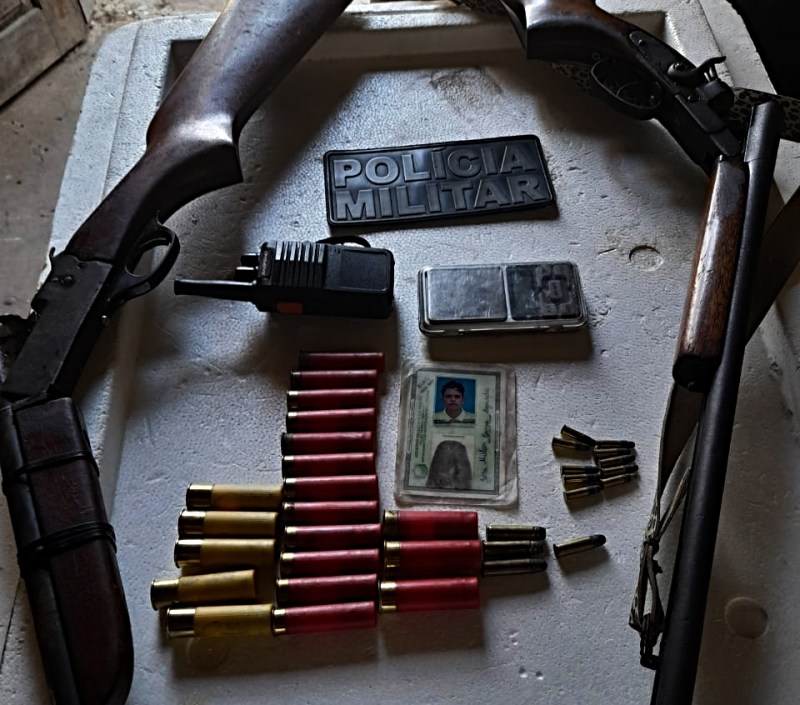 O suspeito percebeu a chegada dos militares e conseguiu fugir armado para uma área de mata. Após buscas pelo local, foram encontrados em um barraco, duas armas longas de espingarda calibre. 28; 33 munições de calibres. 16, 20, 22, 32 e 38; um rádio comunicador e uma balança de precisão. Os policiais também encontraram documentos de identificação do criminoso. Todo o material apreendido foi conduzido para a Delegacia de Itaituba.