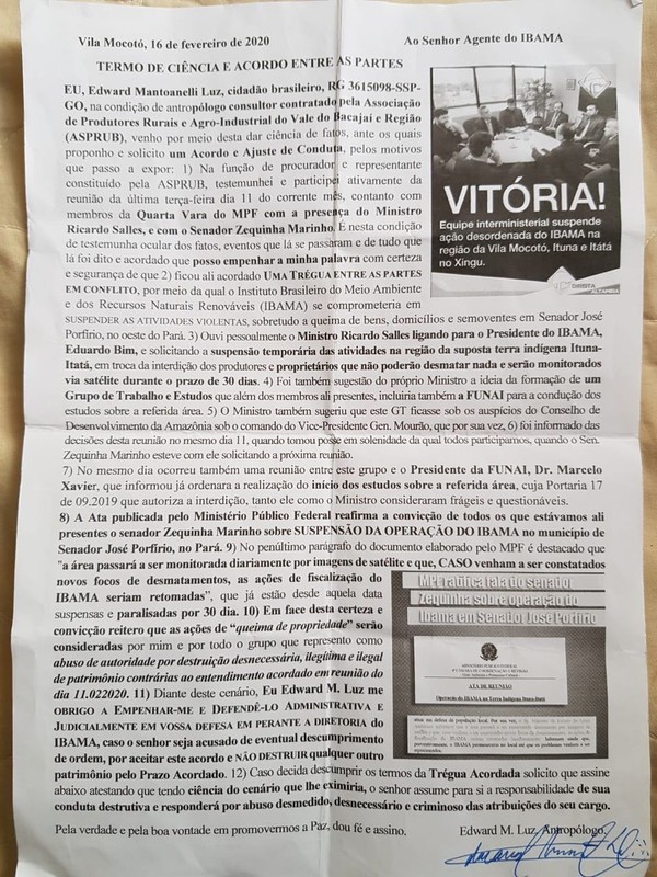 Em documento divulgado e assinado por Luz, ele seria consultor da associação e alegou ter participado da reunião que definiu acordo com o Ibama para suspender a retirada de famílias em situação de vulnerabilidade social em uma região não reservada no sudoeste do Pará. Nem Edward Luz e nem a Asprub são citados na ata da reunião que discutiu as operações do Ibama na região.