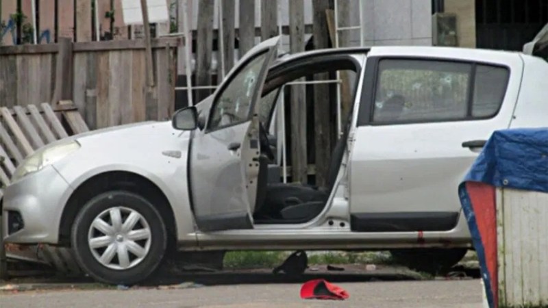 No vidro do carro é possível visualizar as marcas de disparo de arma de fogo e o resultado da troca de tiros.