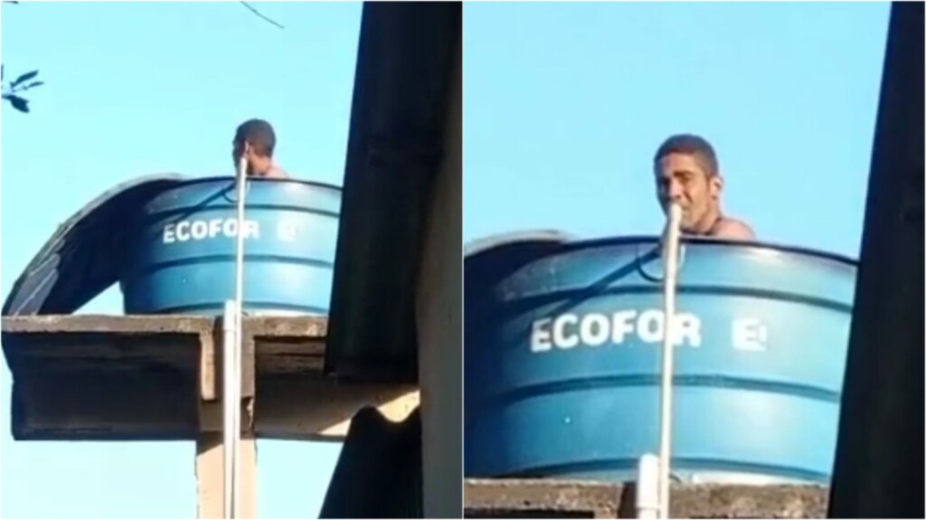 De acordo com informações, vizinhos perceberam uma movimentação estranha dentro da casa de um policial e, ao verificarem a situação, avistaram um homem tomando banho “alegremente e contemplando a paisagem nas alturas”. A cena surpreendeu a todos e rapidamente foi compartilhada nas redes sociais. Assista: