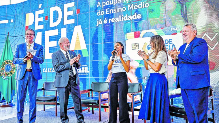 O presidente Luiz Inácio Lula da Silva (PT) entregou os primeiros cartões do Programa Pé-de-Meia a um grupo de estudantes em cerimônia no Palácio do Planalto, nesta segunda-feira (25). O programa federal vai pagar bolsas e uma poupança para manter alunos em situação de vulnerabilidade no Ensino Médio.
