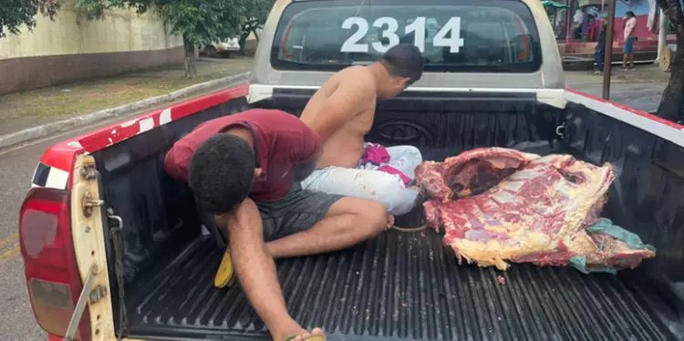 Dois homens foram presos na manhã de terça-feira (21) suspeitos de furtarem e matarem uma vaca prenha em Parauapebas, no sudeste do Pará. O crime teria ocorrido na noite do último sábado (18) em uma chácara localizada na Palmares III. Os envolvidos foram identificados como José Carlos Santana da Silva e Antônio Maciel Silva Gomes. Mais de 200 quilos da carne do animal foram recuperadas pela polícia, que estavam sendo vendidas em um açougue do município.