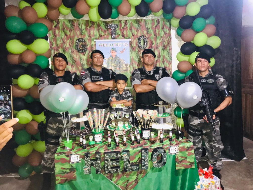 Policiais Militares do Grupamento Tático Operacional (GTO) do 9º Batalhão, vinculado ao Comando de Policiamento Regional XII (CPR XII), com sede em Breves, no Marajó, marcaram presença na festa de aniversário do pequeno Hélio Neto que completou 5 anos, no último sábado (15). Vestido com a farda camuflada do GTO, o aniversariante ficou feliz com a presença dos militares.