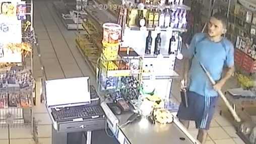O acusado roubou um litro de cachaça do estabelecimento. Um homem ainda aparece no vídeo com um pedaço de madeira, mas “Naldinho” não se intimida.
