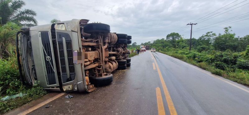 Uma carreta que transportava grãos de soja, tombou nesta terça-feira (20), na rodovia PA-150, próximo à vila Betânia, zona rural de Moju.