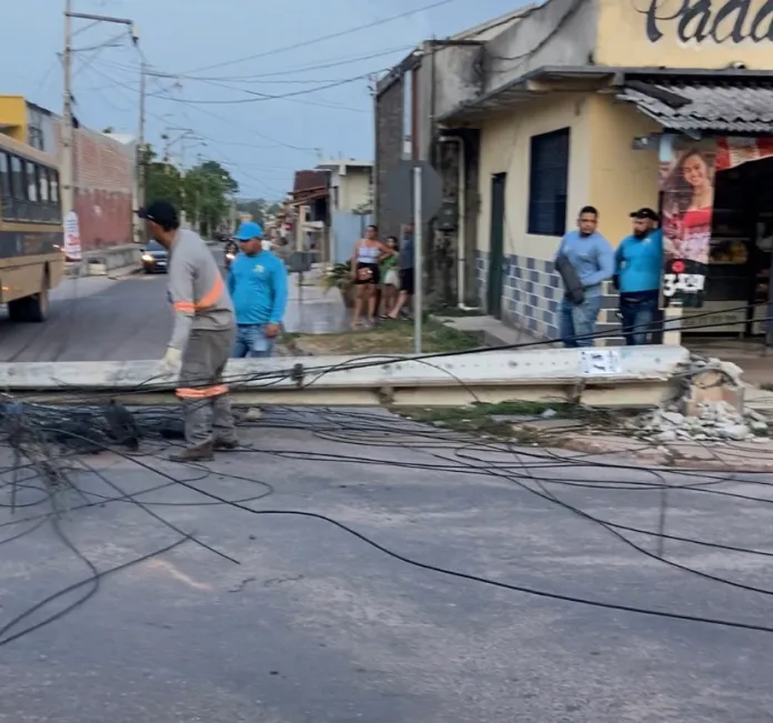 Um poste de energia elétrica, que já havia sido denunciado por moradores por estar prestes a cair, desabou na tarde desta quinta-feira (25), no Centro de Moju, e derrubou fios de alta tensão sobre um ônibus escolar. O impacto provocou uma explosão, gerando pânico entre os passageiros e moradores da região.