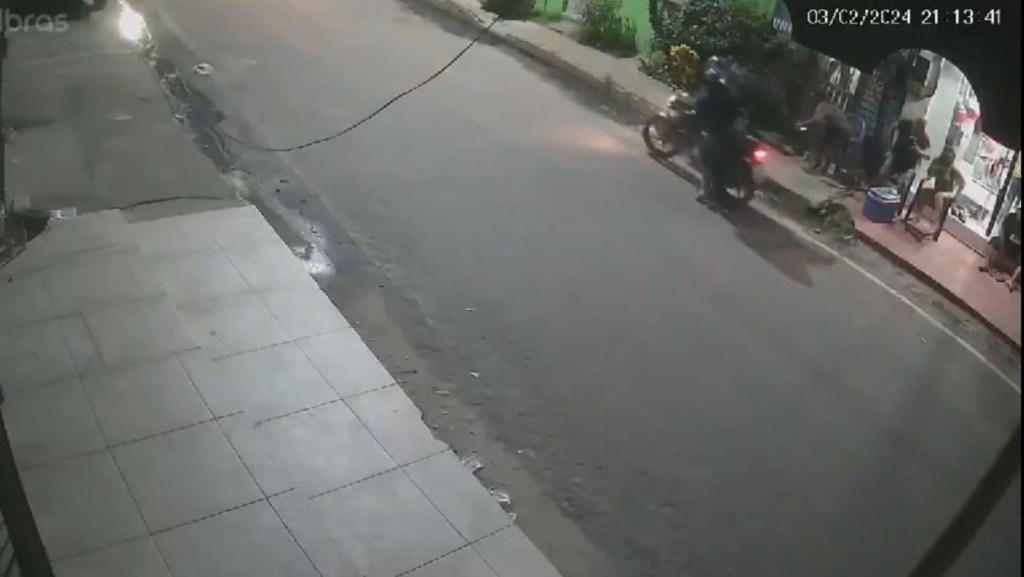 As imagens mostram o momento que dois homens, em uma motocicleta, se aproximam do PM que estava sentado em frente a um estabelecimento comercial na companhia de outras pessoas.