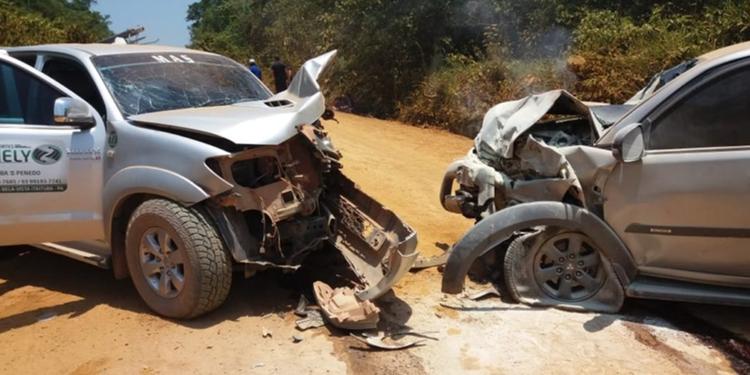 As caminhonetes, modelos Hilux e Triton, ambas de cor cinza, trafegavam em direções opostas e colidiram de frente.