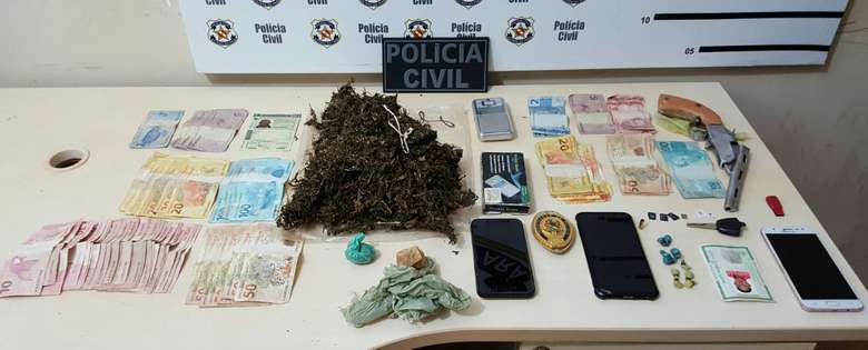 Nas buscas e com os presos, a Polícia apreendeu R$ 1.588,00 em espécie, aproximadamente 50g de pedra oxi, 10 petecas de pedra oxi, uma grande porção de maconha, uma arma de fogo, uma motocicleta Honda Bros 150 e uma Pick-up Fiat Estrada Cinza que estariam sendo usadas no tráfico de drogas.