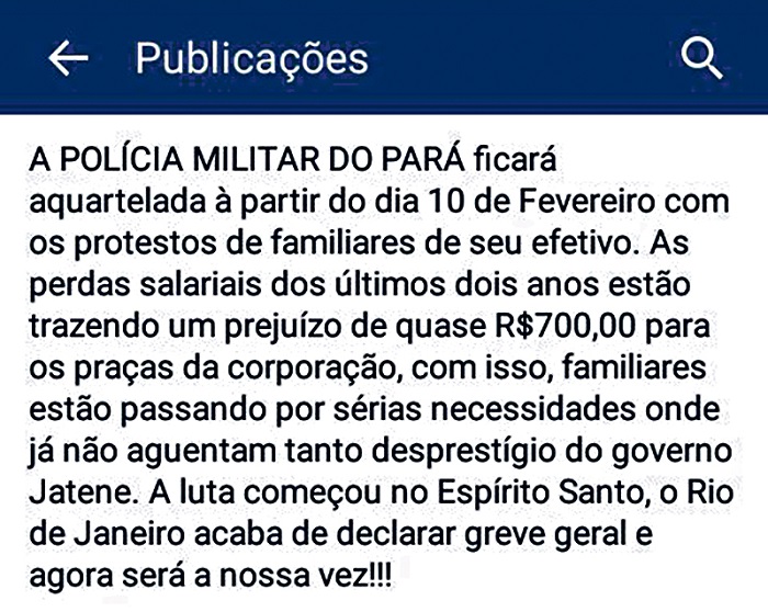 Devido ao aquartelamento dos policias militares do Estado do Espírito Santo, que desde o último sábado (4) não saem mais às ruas, algumas mensagens começaram a surgir nas redes sociais nos últimos dias, informando que o movimento também chegaria ao Pará.