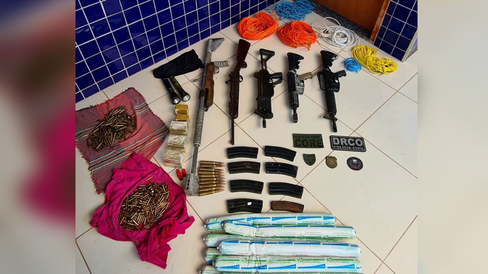 Uma casa de madeira foi escolhida como o “comando” dos criminosos. Apesar de simples, para disfarçar qualquer movimentação de populares do entorno, o local abrigava forte aparato de armas, munições e acessórios. Foram apreendidos 03 fuzis, sendo um .50, que é utilizado para furar a blindagem dos veículos. Esse armamento também é utilizado para derrubar aviões. Alem dos fuzis, a PC apreendeu uma carabina, um rifle, 14 explosivos, chapas de aço, carregadores de armas, munição e dois veículos que seriam utilizados no crime. Os carros já estavam com o interior modificado para a realização do roubo.