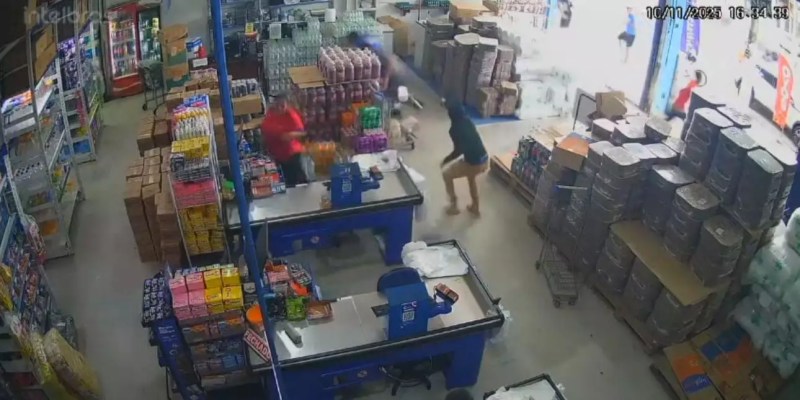As imagens mostram o momento em que o policial está sentado dentro de um estabelecimento comercial, próximo a um dos caixas. Pelo menos três homens chegam ao local. Um deles usa a própria camisa para cobrir o rosto, enquanto outro já entra mascarado e vai direto em direção ao policial.