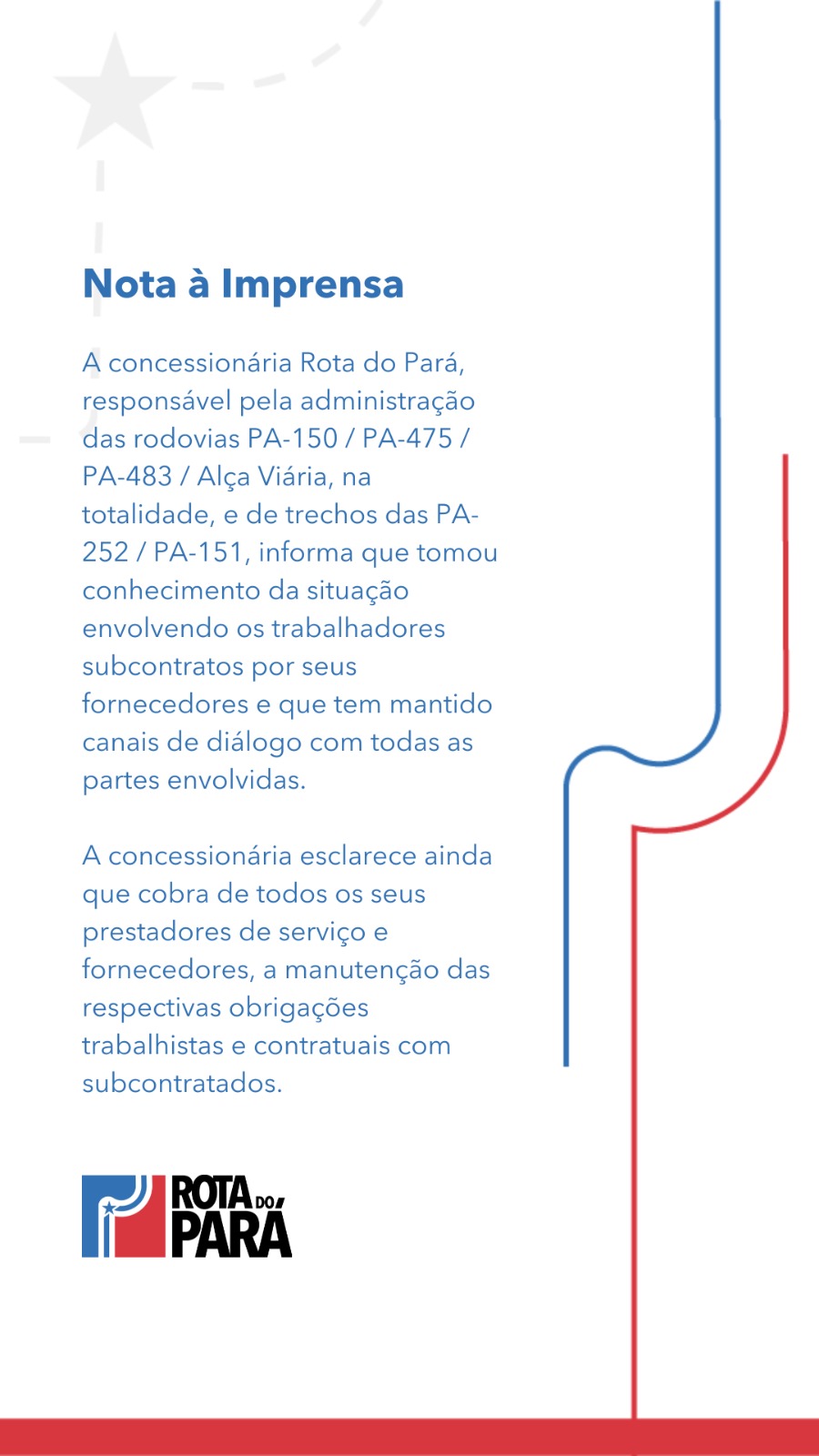 A concessionária Rota do Pará, responsável pela administração das rodovias PA-150 / PA-475 / PA-483 / Alça Viária, na totalidade, e de trechos das PA-252 / PA-151, informa que tomou conhecimento da situação envolvendo os trabalhadores subcontratos por seus fornecedores e que tem mantido canais de diálogo com todas as partes envolvidas.