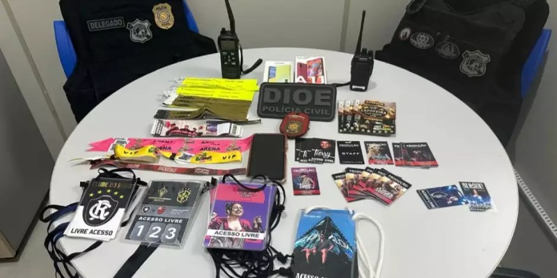 Durante o cumprimento dos mandados, foram encontrados vários crachás e pulseiras de acesso livre a eventos culturais e esportivos, além de um aparelho celular. Todo o material foi apreendido e apresentado na delegacia especializada.