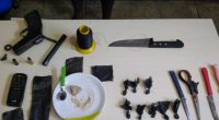 No total, foram apreendidos nove aparelhos de telefone celular, três porções de substância entorpecente, vulgarmente conhecida por “maconha”, e diversos carregadores e fones de ouvido.