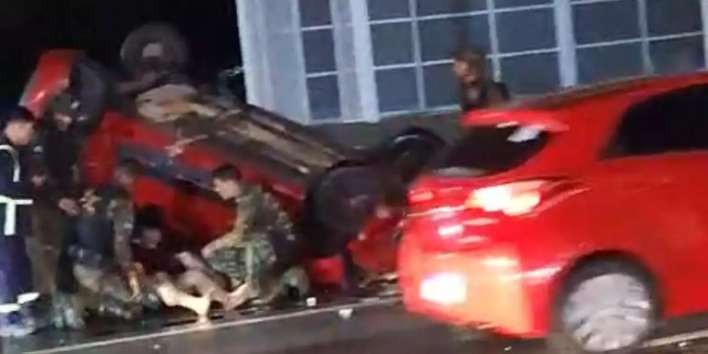 Imagens que circulam nas redes sociais mostram o carro capotado, com as rodas para cima. Um homem, que estaria dentro do veículo no momento do acidente, aparece sentado ao chão recebendo auxílio de militares do Exército e de trabalhadores das obras do BRT.