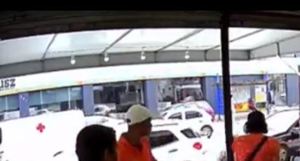 Imagens registradas por câmera de segurança do estabelecimento mostra o momento que o homem chega armado e rende os clientes da padaria.